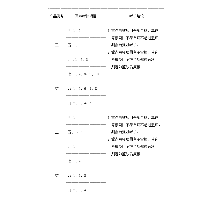 第七条 质量体系现场考核,参照质量体系认证审核的方法;依据附件1自查表确定的内容进行考核,重点考核项目及判定规则为: