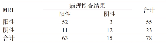 MRI 检查诊断胰腺癌的灵敏度、特异度、准确度、阳性预测值、阴性预测值分别为 82.51%(52/63)、80.00%(12/15)、82.05%(64/78)、94.54%(52/55)、52.17%(12/23),见表 1。