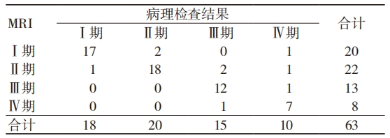 以病理检查为金标准,63 例胰腺癌患者经 MRI诊断胰腺癌临床分期Ⅰ、Ⅱ、Ⅲ、Ⅳ期的准确度分别 为 94.44%(17/18)、90.00%(18/20)、80.00%(12/15)、70.00%(7/10),总准确度为 85.71%(54/63);MRI 诊断胰腺癌临床分期与病理检查结果的 Kappa 值为 0.705,一致性较好。见表 2。