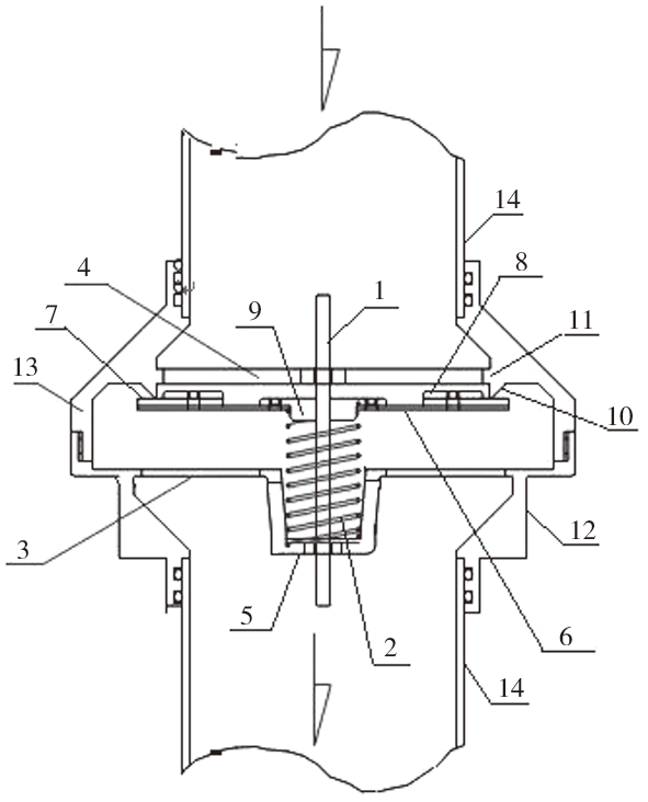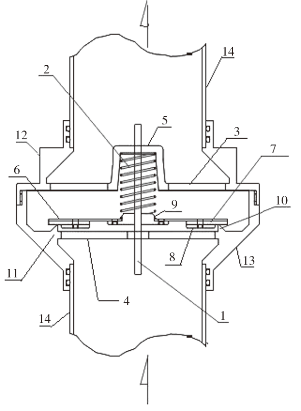 注:1 为轴向滑配中心轴,2 为支撑弹簧,3 为前镂空支架,4 为后镂空支架,5 为前凸镂空桶形座,6 为阀片,7 为弹性密封片,8 为环状压板,9 为前凸台,10 为前伸管座,11 为内凸环,12 为前扩管帽节,13 为后扩管座节,14 为上下游流通管路。