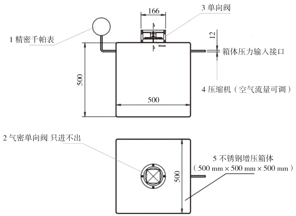注:1 为精密千帕表,2 为气密单向阀,3 为单向阀,4 为空气压缩机,5 不锈钢增压箱体。