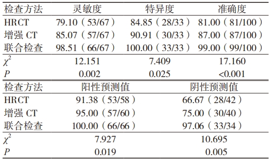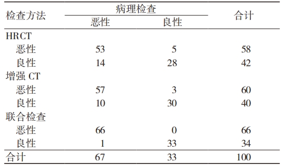 100 例疑似 SPN 患者, 经 HRCT 检查显示,SPN 恶性 58 例,良性 42 例,与病理检查结果具有中等一致性(Kappa = 0.598);增强 CT 检查结果显示,SPN 恶性 60 例,良性 40 例,与病理检查结果具有较强一致性(Kappa=0.721);两种方法联合检查结果显示,SPN 恶性 66 例,良性 34 例,与病理检查结果具有极强一致性(Kappa = 0.978)。见表 1。