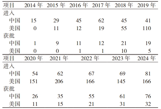 表 1 2014—2024 年中美进入创新通道和获批的创新器械产品数量(个)