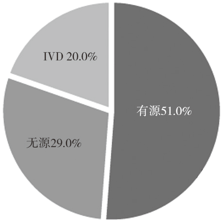 中国获批上市的创新器械中,有源医疗器械占据主导地位,共计 205 个(62.9%);无源医疗器械次之,共 95 个(29.1%),而体外诊断试剂(in vitro diagnostic products,IVD)的获批数量相对较少,仅 26 个(8.0%),见图 1。相比之下,美国获批的 127 个创新器械中,有源医疗器械占比略低(65 个,51.0%),无源医疗器械占比与中国相近(37 个,29.0%),但体外诊断试剂的获批比例显著高于中国(25 个,20.0%),见图 2。