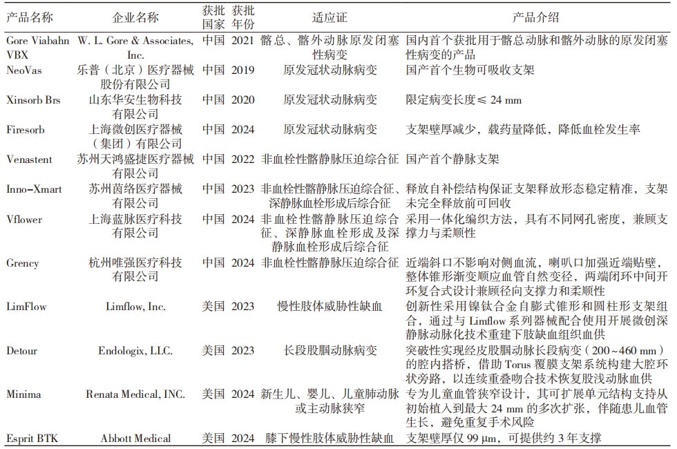 血管支架通常由支架和(或)输送系统组成,用于治疗动脉粥样硬化以及各种狭窄性、阻塞性或闭塞性等血管病变。已获批血管支架创新器械主要包括:血管支架、药物洗脱血管支架、静脉支架等 [3,12]。