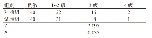 治疗 4 周后,试验组 ADL 等级优于对照组(P< 0.05),见表 4。