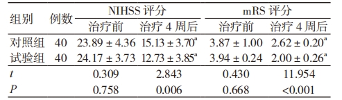 注:与同组治疗前比较,aP< 0.05。NIHSS 为神经缺损功能量表,mRS 为改良 RANKIN 量表。